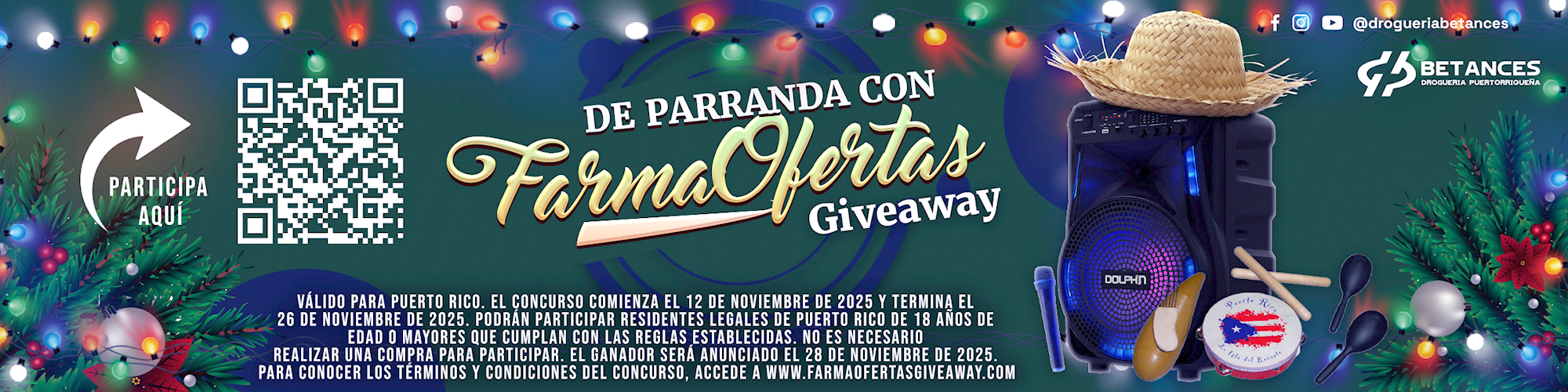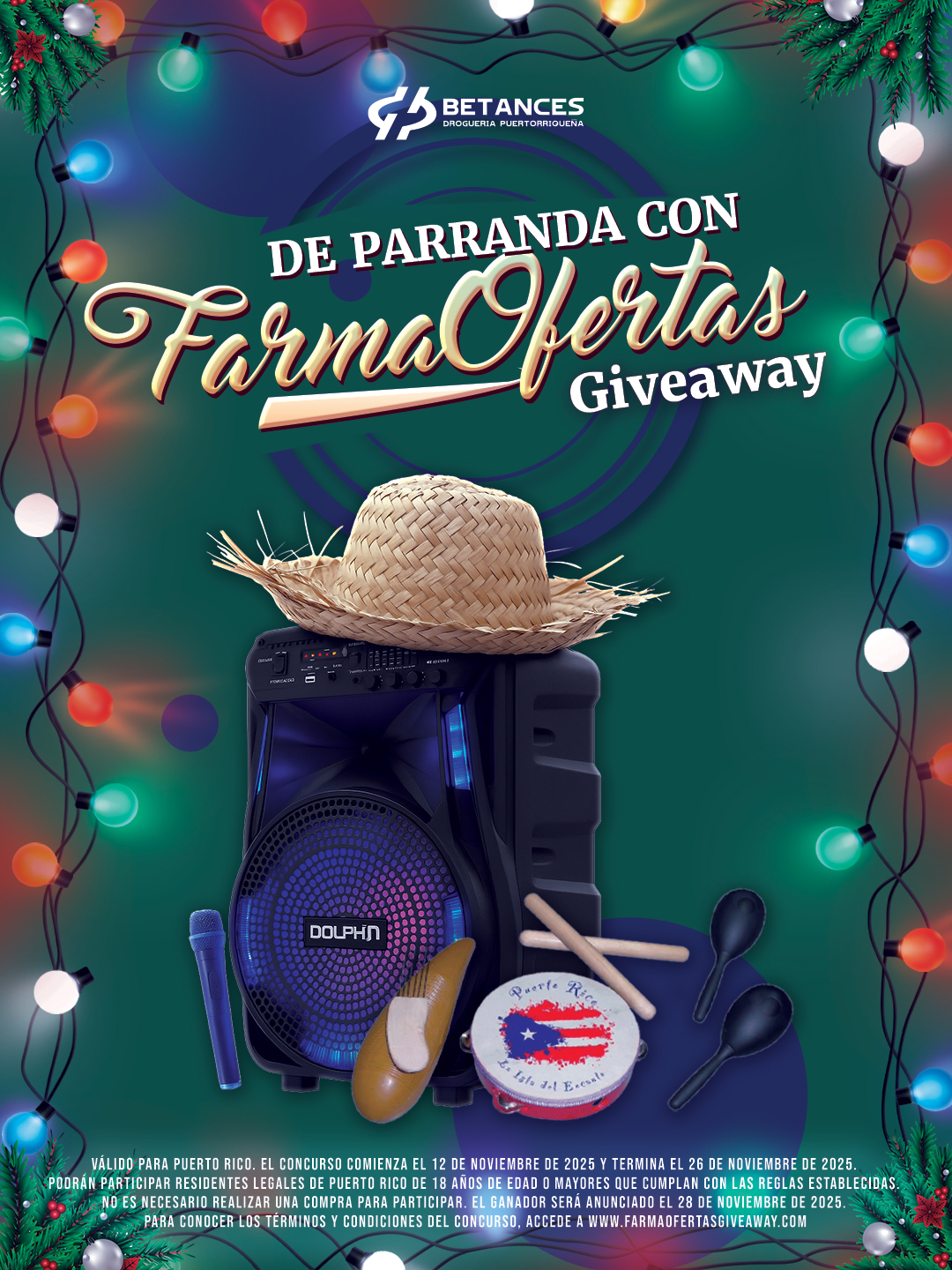 - El ganador del Concurso «De Parranda con FarmaOfertas Giveaway» autoriza expresamente a Droguería Betances, sus agencias de publicidad y/o a cualquier persona o entidad autorizada por estos, a utilizar sin limitación alguna su nombre, voz e imagen, total o parcialmente, para fines de publicidad, promoción o cualquier propósito legítimo relacionado al Concurso, sin que por ello se genere compensación adicional.